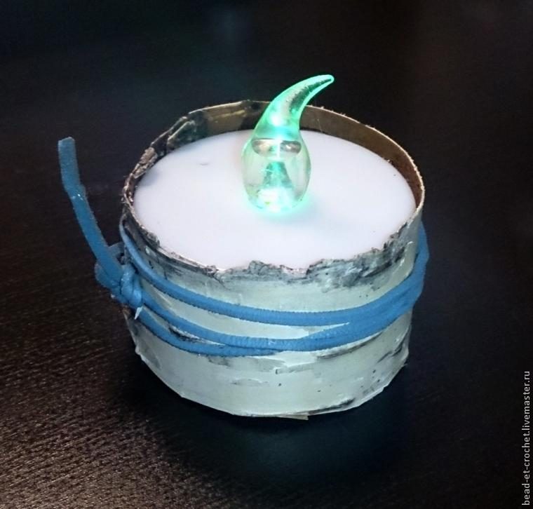 На просторах интернета часто встречались подсвечники из полешек березовых, вот так они уж мне запали — решила сделать подобие. Образала бересту по форме свечи с небольшим запасом (2-3 мм) сверху и снизу и приклеила ее к свече. Обернула резинкой для фиксации: