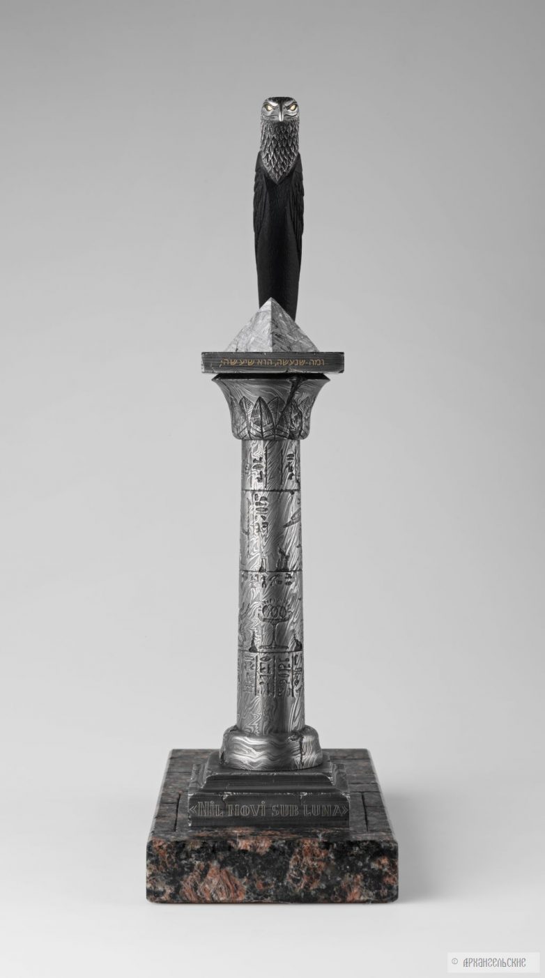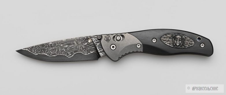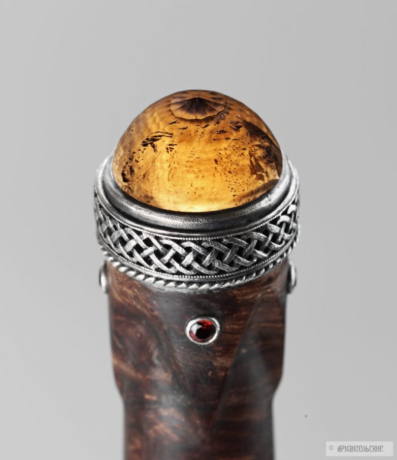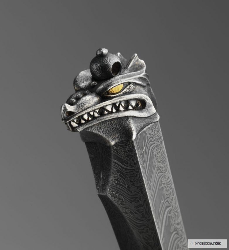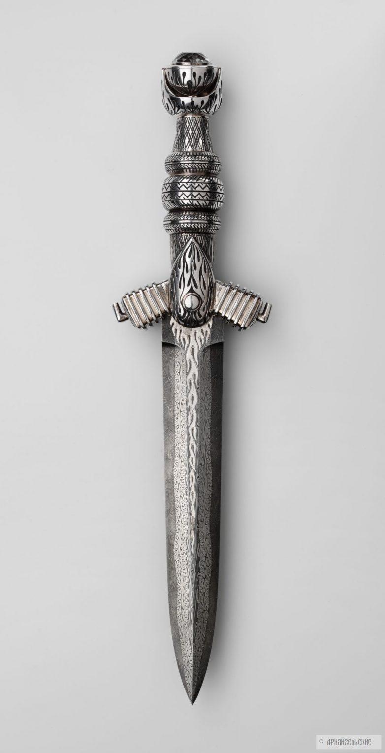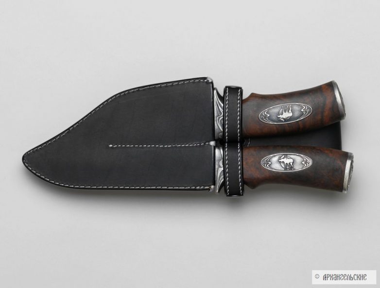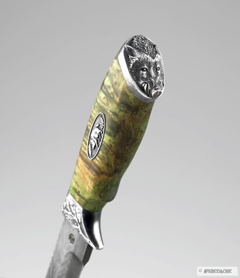 Архангельские занимаются только металлом, приведу слова самого Леонида: «Мы – кузнецы. Занимаемся лишь изготовлением сложных видов сварочного дамаска и литого булата. Рукояти клинков, гравировку и прочие шкатулки делают другие мастера и фирмы, потому что каждый должен заниматься своим делом. Если распылять свои интересы и усилия, многого не добьешься. А в клиночном деле мы поставили себе задачу если и не достичь вершин мастерства, то хотя бы приблизиться к ним. Итак, дамаск и булат – основное направление нашей работы, но поскольку в отрыве от целого и основное смотрится ущербно, то на этом сайте клинки нашей работы представлены в наиболее удачных законченных работах.»