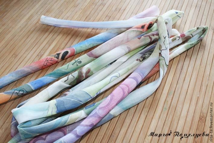 — батичные лоскуты подкладочного шелка (сойдет вообще любая ткань, которая вам нравится, но достаточно тонкая, чтобы узлы получались не с кулак);
