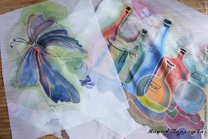 Вам понадобятся лоскуты ткани, расписанные в технике батик. Откуда они берутся? Обычно начинающие рисовальщики батика или не начинающие, но пробующие новые краски или техники, оставляют за собой много лоскутов, которые на стену не повесить, подарить стыдно, а выбросить жалко.