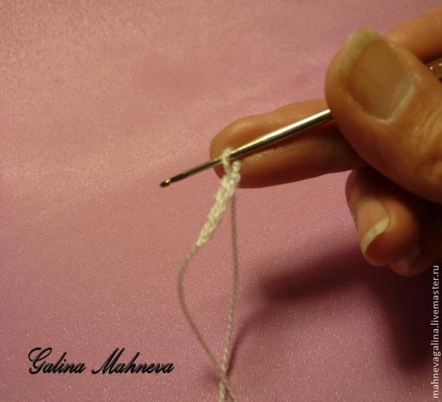 Затем отводим рабочую нить в сторону правой руки, как можно ближе к петлям на крючке.