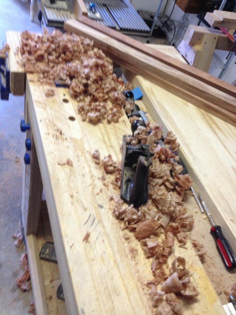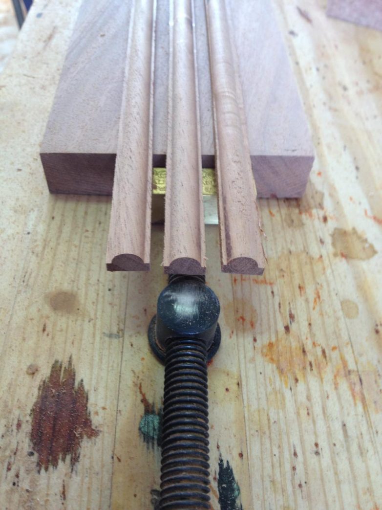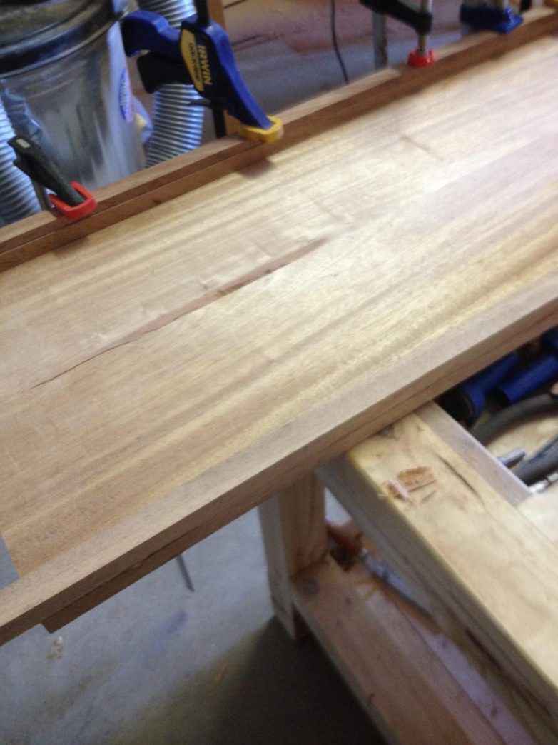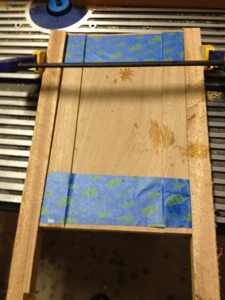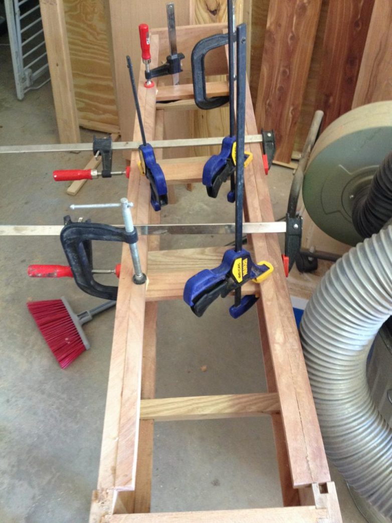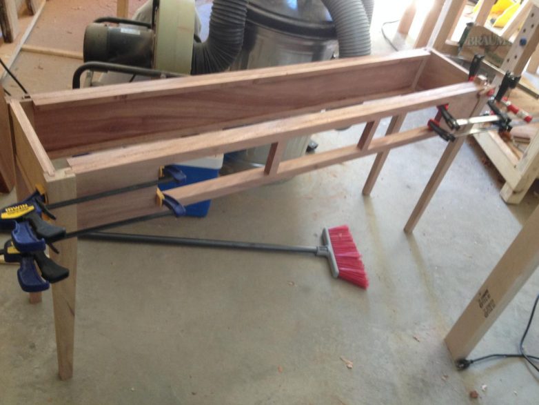 Склеиваем составляющие передней части столика, в которую будут вставляться ящики. Стягиваем струбцинами до полного высыхания