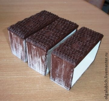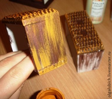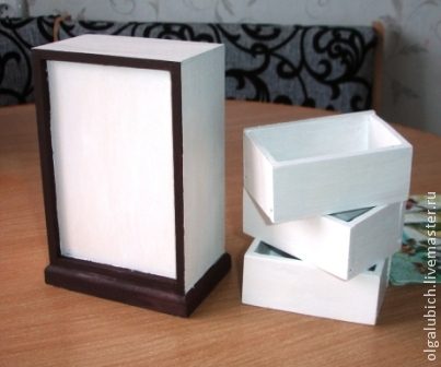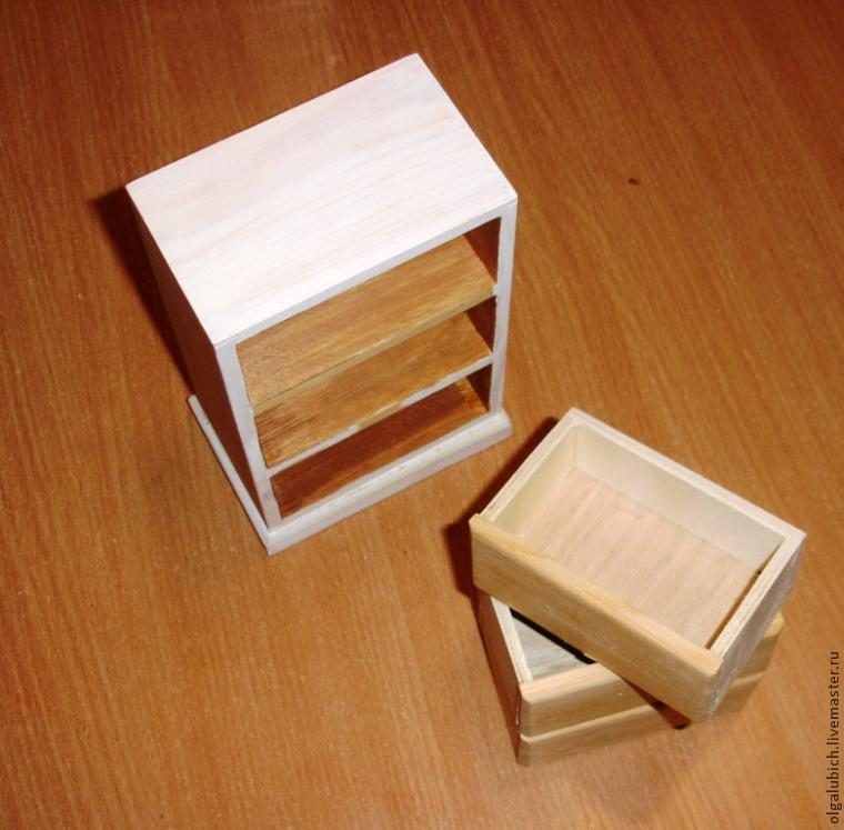 Внутренности комодика и нижнюю часть тонируем морилкой. Боковые стороны комодика, ящички грунтуем. Немного шкурим для гладкости. Края красим акриловой краской цвета сиена жженая.