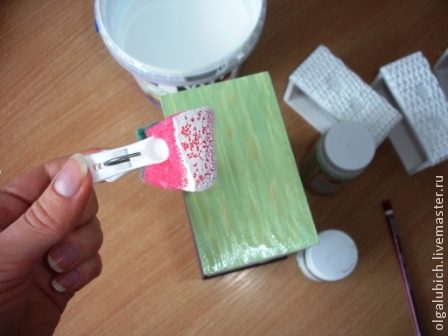 Те места, где планируются трещинки, красим цветом мятный мусс. После высыхания краски наносим кракелюрный лак. Когда лак немного подсохнет, но не высохнет совсем, губкой наносим белую краску, ни в коем случае не проходя дважды по одному месту.