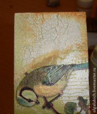 После высыхания слоя с трещинками можем приступать непосредственно к декупажу, то есть наклеиванию изображения. Подбираем нужные фрагменты, размечаем, отрезаем, приклеиваем. Я приклеиваю на ПВА, промакивая салфетку кистью, и легонько провожу пальчиком для удаления лишнего клея и пузырьков воздуха.