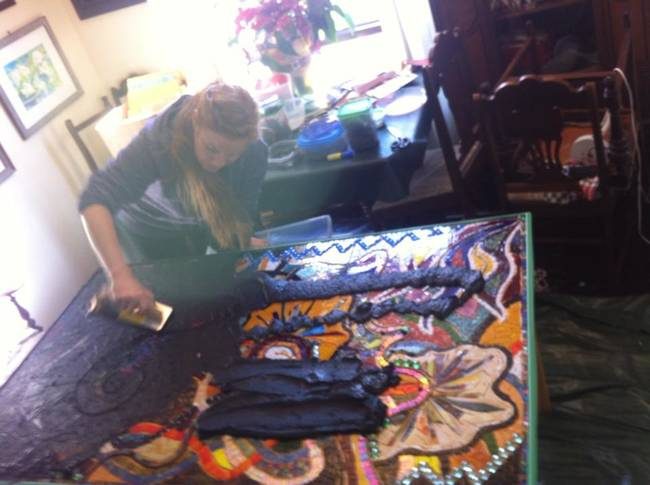 Сначала девушка промазала клеем для дерева все трещины и составные части стола