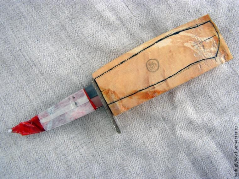 Например, нитку закрепляем на кончике лезвия и натягиваем ее вдоль клинка до конца будущей рукояти.