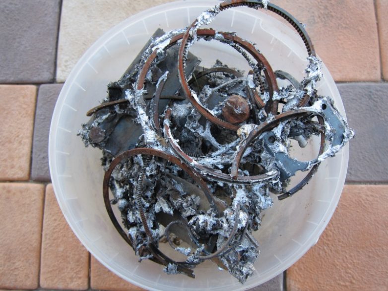 5)Расплавленный алюминий заливаю в формы. Когда металл застыл отбиваю корку, литники и выпоры.