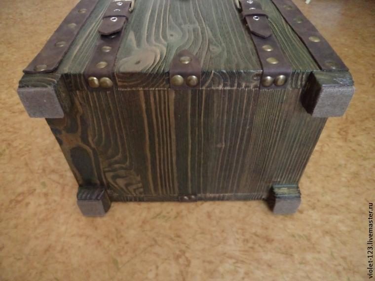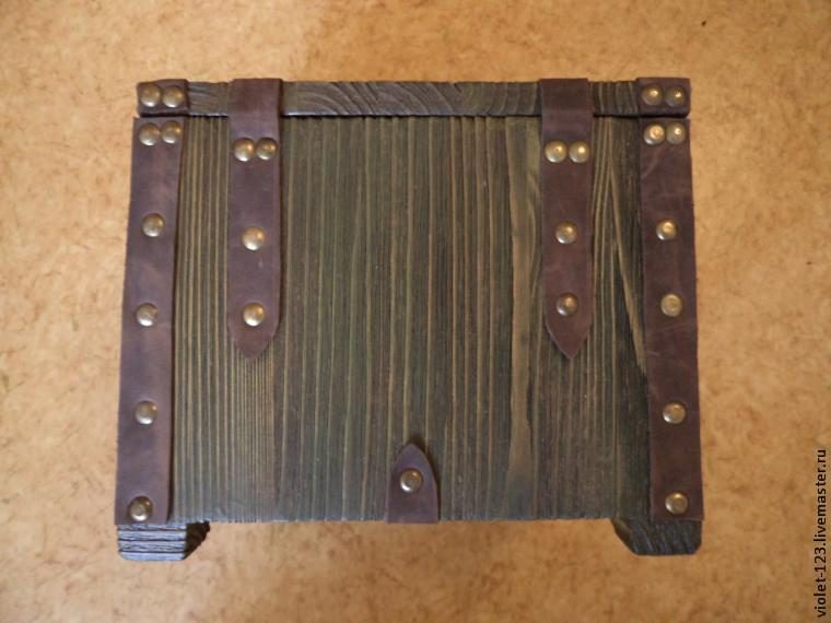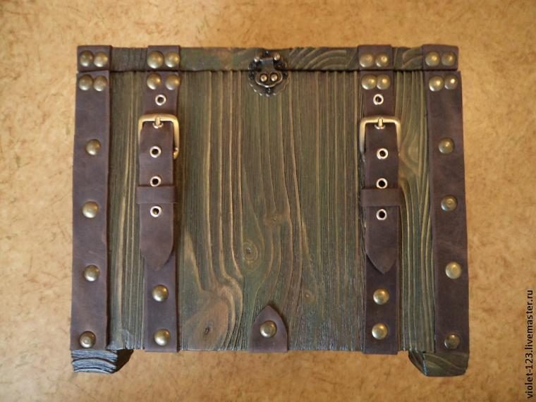 Нарезаем кожу полосками шириной 2 см., что соответствует размеру наших бляшек. Изготавливаем ремешки длина которых соответствует высоте лицевой стенки сундука, плюс захват на днище, равный толщине его стенки. Затем прибиваем полученные ремешки с лицевой стороны изделия на таком же расстоянии от краев сундука, как и наши петли. Используем декоративные гвозди.