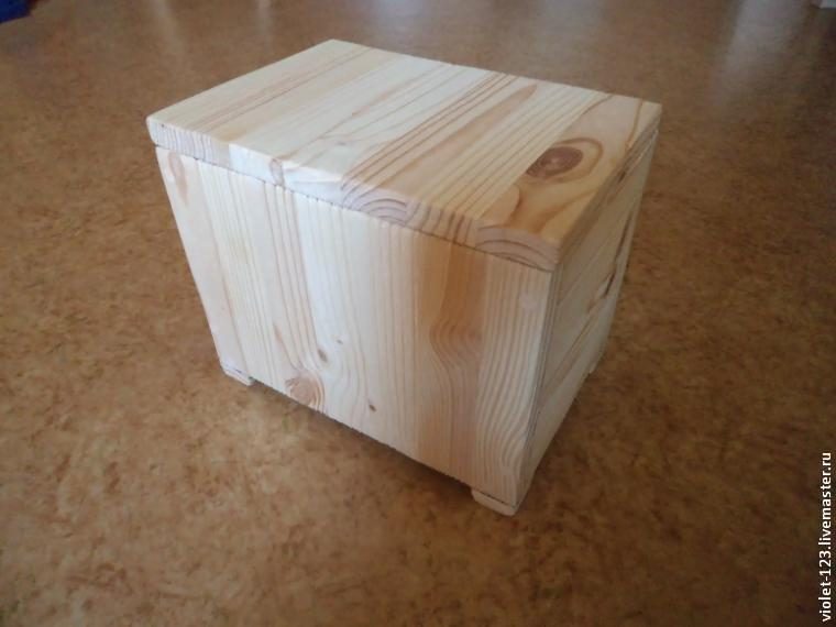 Этот сундук имеет размер: длинна 28 см, высота 24 см, глубина 20 см, но вы можете изготовить его нужного именно вам размера. Итак, определившись с размерами, осуществляем распил щита на стенки, днище и крышку, а также четыре ножки. Для примера размер ножек у данного изделия: длина 3 см, глубина 3 см, высота 2 см.