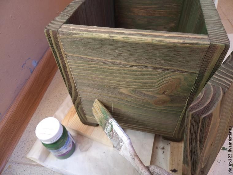 Затем нужно добиться эффекта зеленого мха на поверхности изделия. Для этого нам потребуется акриловая краска цвета окись хрома. Краску нужно слегка разбавить водой и обработать ею всю поверхность сундука. После этого, не дожидаясь высыхания краски, протираем изделие влажной тканью, удаляя ее излишки.