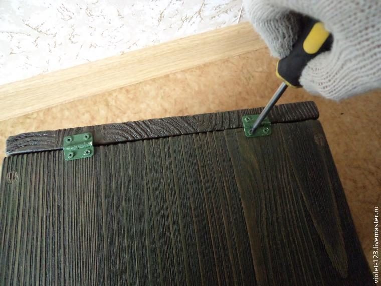 Теперь прикручиваем петли, располагая их на расстоянии 5 см. от краев изделия. Ширина петли 2 см.