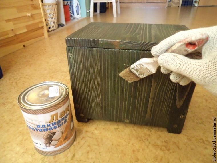 Добившись нужного эффекта, снова покрываем изделие грунтом. Следим за ворсом. Просушиваем. Затем покрываем сундук матовым паркетным лаком в один или несколько слоев на ваше усмотрение. Используем именно паркетный лак, потому что он обладает высокой износоустойчивостью. Это позволит сохранить наше изделие.