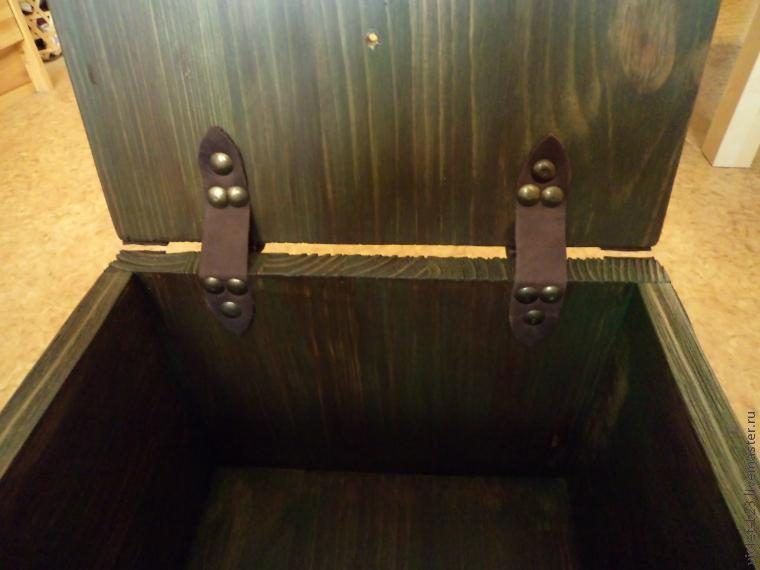 Теперь нам нужно из ремешков изготовить ограничители открывания крышки. Расположены они будут точно напротив петель изнутри сундука. Длина ремешков будет зависеть от того, на сколько далеко будет откидываться крышка, а это на ваше усмотрение.