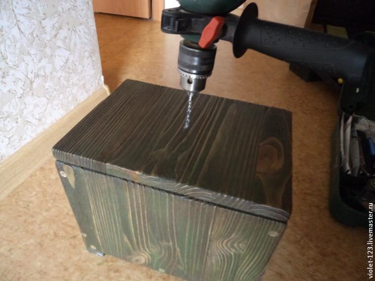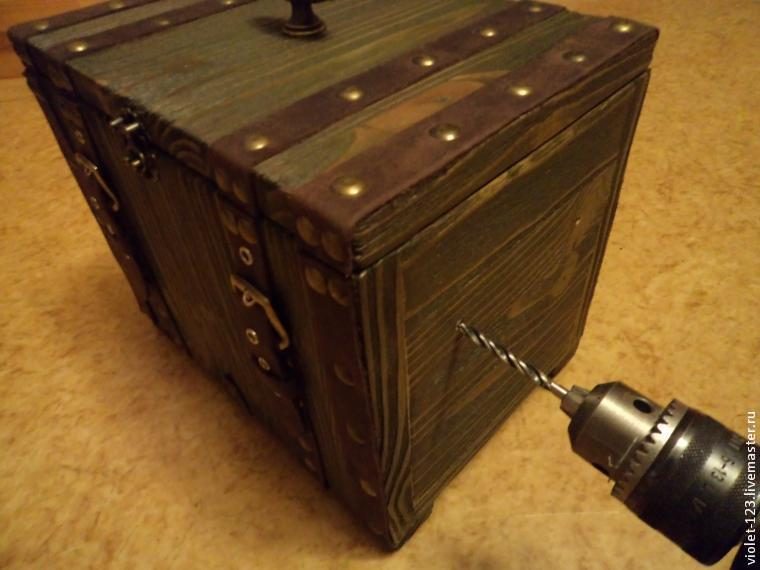 Приступаем к установке фурнитуры. Сверлим отверстие в центре крышки сундука и устанавливаем ручку-переноску.