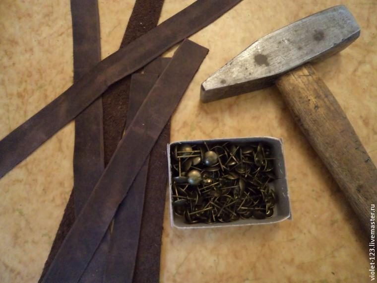 Приступаем к отделке изделия кожаными ремешками. Для этого нам понадобиться: кожа размером 50*50 см., люверсы внутренним диаметром 4мм., клепочник для люверсов, пробойник с диаметром 4 мм., две бляшки размером 3*3 см., декоративные, обивочные гвозди.