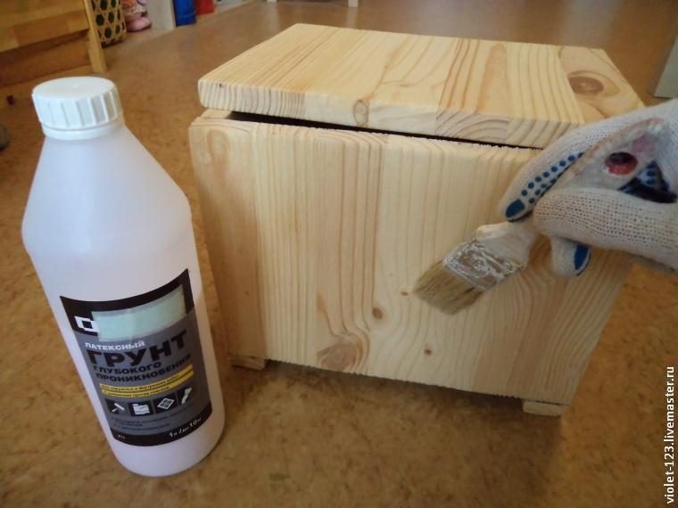 Далее мы покрываем сундук грунтом, которым пользовались ранее. После того, как грунт высохнет, обращаем внимание на ворс. Если ворс поднялся, удаляем его наждачной бумагой и протираем изделие влажной тканью, удаляя образовавшуюся пыль.