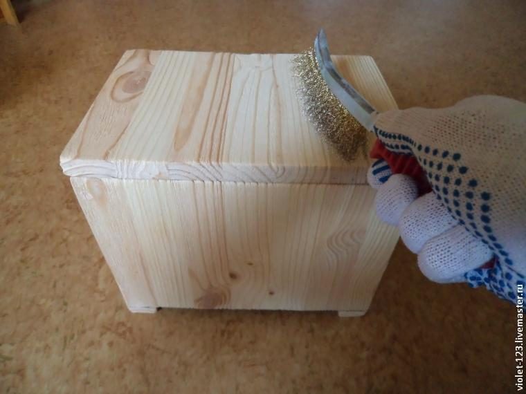 Приступаем к этапу проявления структуры дерева. Нужно обработать щеткой по металлу все наружные поверхности будущего сундука, включая торцевые его части. Обработку необходимо проводить вдоль волокон древесины, удаляя тем самым более мягкие ткани дерева.