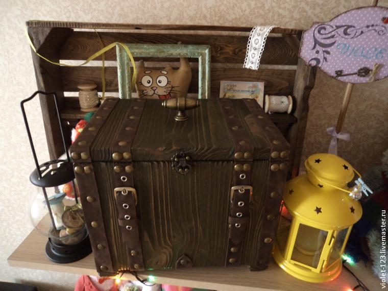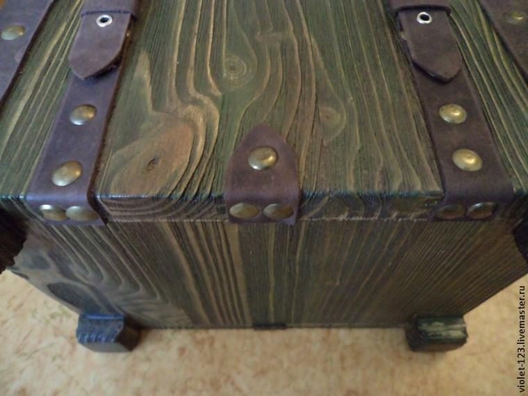 Затем прошлифуйте те стороны стенок, днища и крышки, которые будут составлять внутреннюю часть сундука, иначе после сборки это будет неудобно. Затем собираем все части изделия, кроме крышки, с помощью саморезов по дереву, предварительно просверлив под них отверстия диаметром чуть меньшим, чем диаметр самореза. Делается это для того, чтобы избежать раскола древесины под воздействием самореза (эффект клина). Следите за тем, чтобы длина саморезов не превышала толщину стенок, во избежание сквозных отверстий. После сборки прошпаклюйте шляпки саморезов шпатлевкой по дереву, предварительно надо загрунтовать. Обратите внимание, что шпатлевка после окрашивания может проявить другой оттенок. Чтобы этого избежать, можно заменить шпатлевку на деревянные заглушки, либо в дальнейшем задекорировать эти места ремешками, как сделано в данном случае.