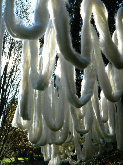 Сначала женщина скатала шерсть в канаты, закрепила их тканью, постирала и сушила 5 часов, чтобы они приняли нужную форму. Затем Otterknot взяла две ПВХ-трубы, которые использовала вместо спиц, и путем нехитрых манипуляций связала одеяло.
