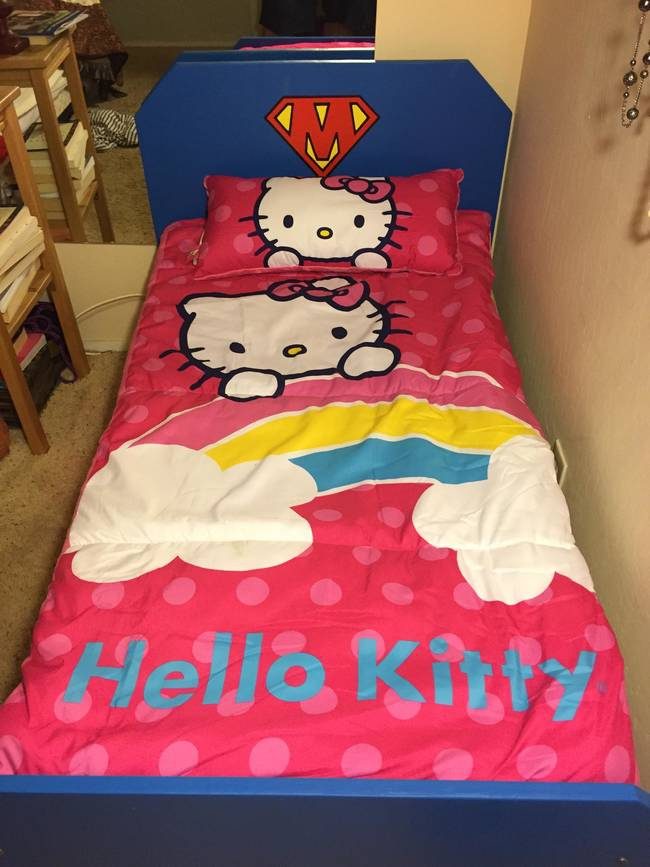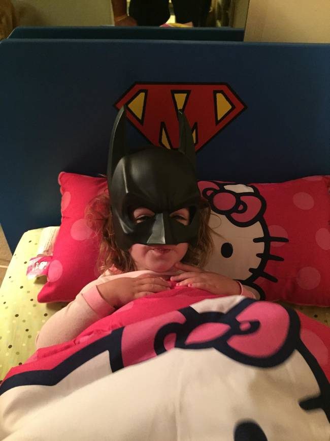 СуперМэри в маске бэтмена под одеялом Hello Kitty. Этим детям не угодишь ))