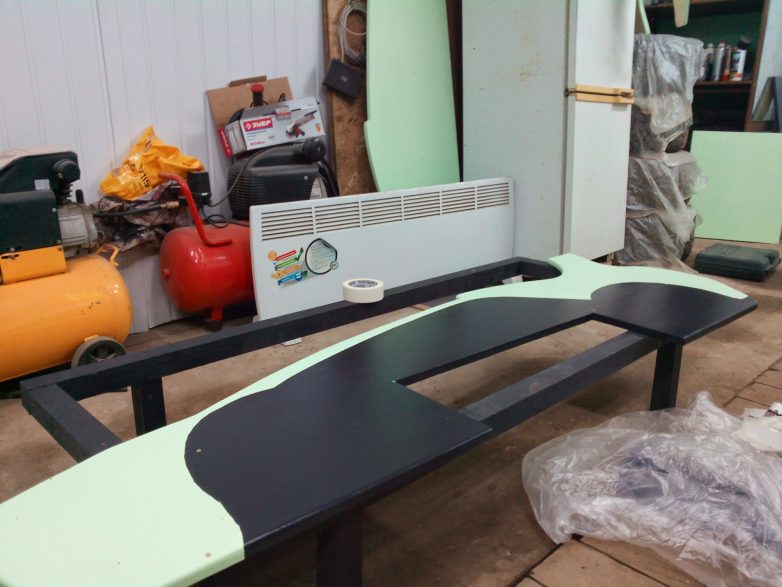 Дальше начинается очень длительный и пыльный процесс вышкуривания, его я не фоткал. Советую запастись терпением, сигаретами и респиратором ;) А ну и конечно шлифмашинкой и кучей листов шкурки.
