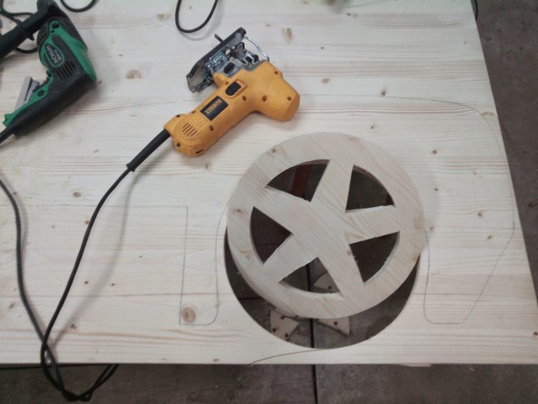 Дальше выпиливаем две большие накладки и остальные колеса из одного листа 1х2м, а из оставшегося большого листа две основные боковины