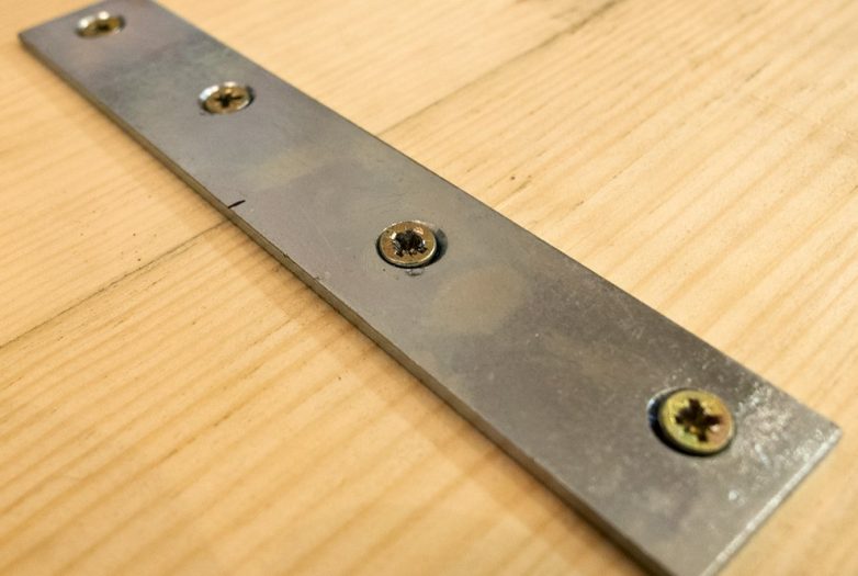 Пришло время укрепить нашу конструкцию. В этом на помогут стальные пластины, шуруповерт и саморезы. Если же у вас отсутствует шуруповерт, то прийдется попотеть с отверткой в руках.