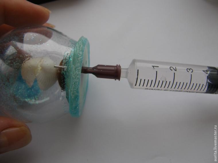 Ждем, когда смола застынет. Заранее я сделала метку для отверстия, чтобы наполнить шар, но моя метка из-за смолы поплыла. Это не страшно: все равно это будет закрыто.