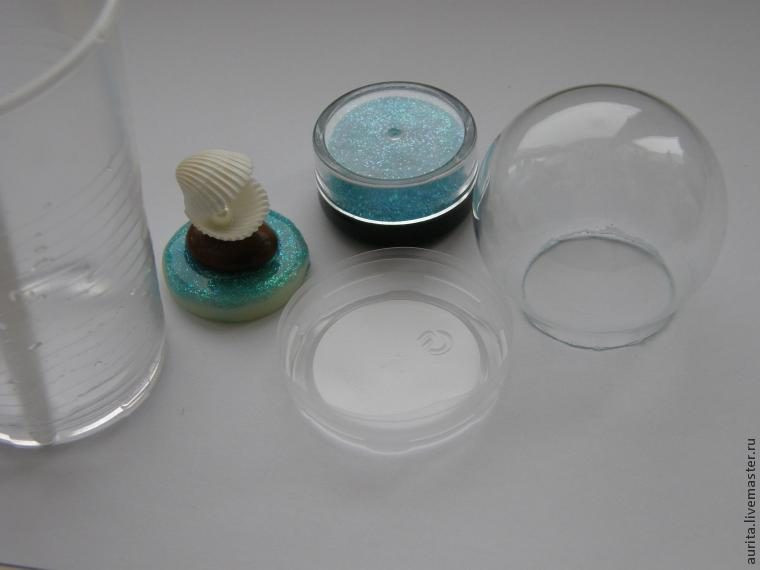 Заливаем смолу в обрезанный стаканчик, насыпаем блестки, ставим скульптуру в стаканчик и накрываем куполом из лампочки.