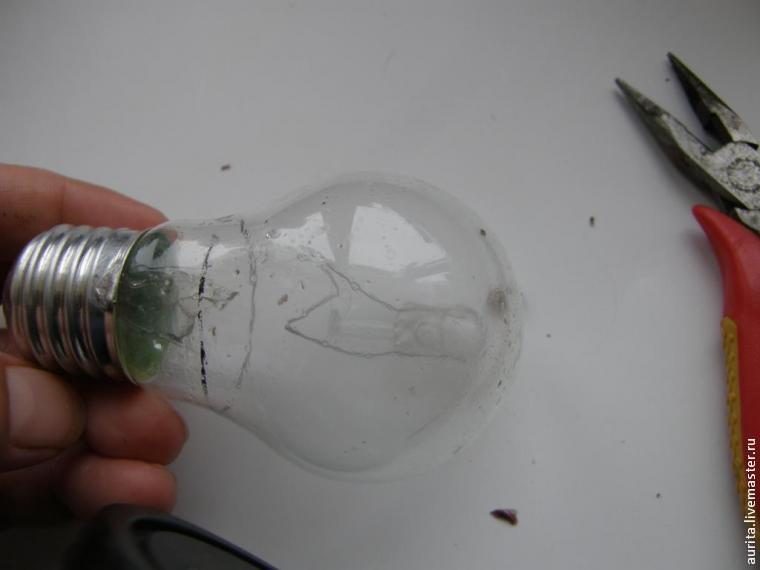 Продолжаем резать, очень нежно по кругу. Уже на 2-3 круге лампочка сама треснет в нужных местах.