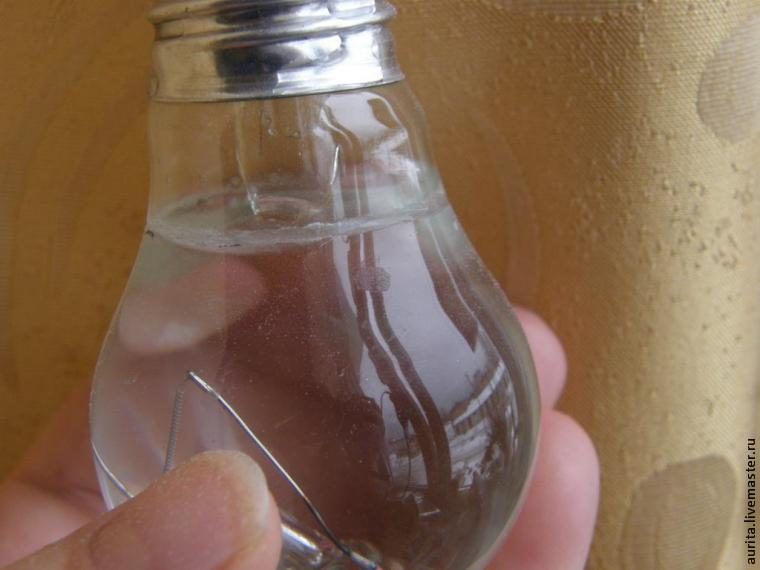 Итак, когда основное устройство лампочки повержено, и мы добрались до колбы. Наливаем в лампочку воду — столько, чтобы она была наполнена до того места, где нам нужно отрезать.