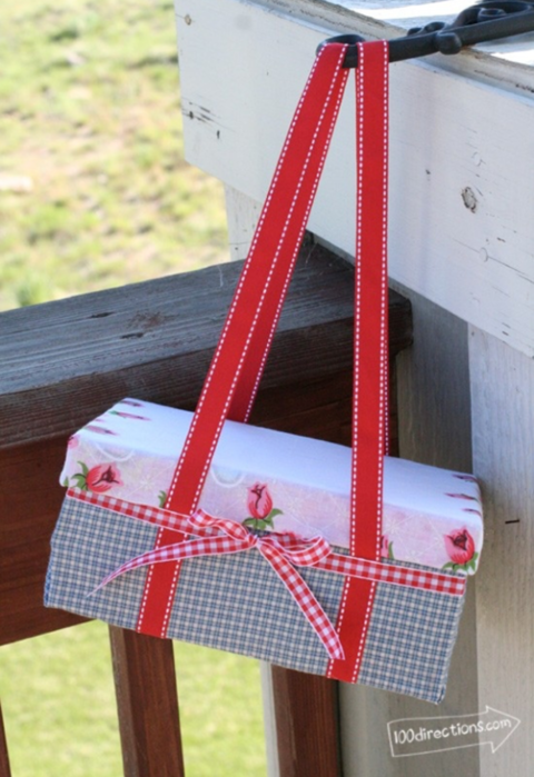 Хочу вам предложить сделать из нее сумочку, а точнее — органайзер для хранения рукодельных штучек. Для работы нам понадобится ткань, ножницы, клей ПВА или горячий клей и тесьма с ленточками. Сотворим?