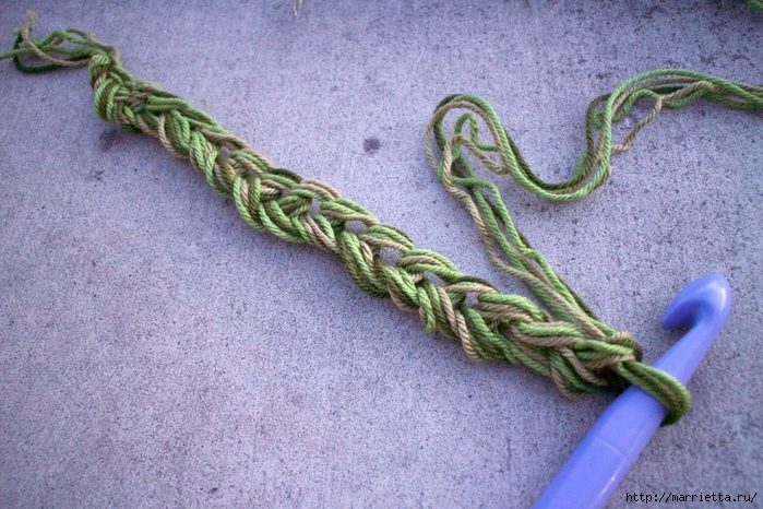 Коврик травку будем вязать 5-ю нитями со всех мотков сразу. Набираем цепочку, как обычно, из 20-ти петель. При таком количестве петель получится коврик длиной приблизительно 40 см.