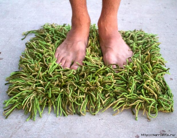 Не хотите потоптать ложную травку? Замечательный коврик, имитирующий зеленую травку, вы можете легко и быстро связать своими руками. Главное — иметь под рукой подходящую пряжу, очень толстый крючок и уметь вязать самую простую вязку столбиками без накида.