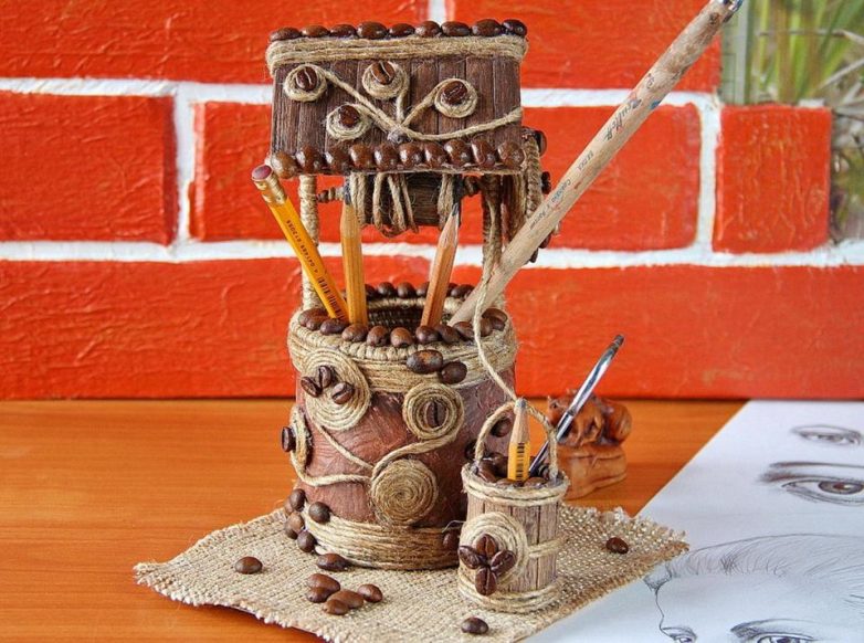 Ведерко и сам колодец можно наполнить зернами кофе, тогда аромат будет сильнее, а хранить канцелярию будет еще удобнее.