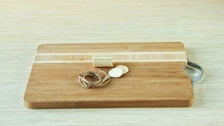 Из картона вырезаем небольшую прямоугольную полоску, склеиваем ее по краю в трубу и обклеиваем деревянными реечками. Также из картона вырезаем круги диаметром на пару миллиметров больше, чем труба. Круги обклеиваем реечками, а по центру делаем небольшие отверстия под проволоку.