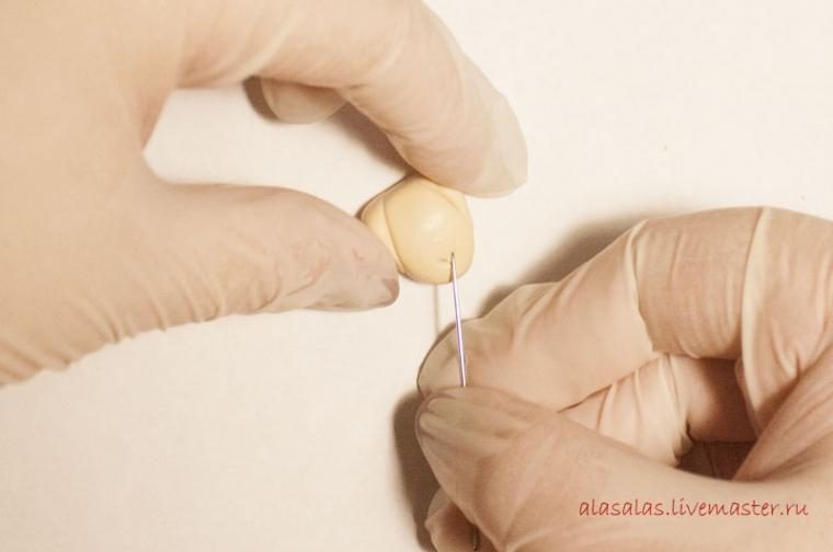 Откладываем мордочку и возвращаемся к четырем оставшимся шарикам. Придаем им каплевидную форму: для этого прокалываем шарик иголкой, слегка надавливая в верхней части, и немного прокатываем бусину между пальцами. Затем вынимаем иголку и проходим сквозь уже готовое отверстие еще раз, немного расширяя его.