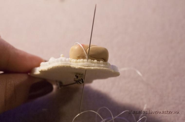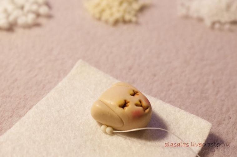 Проделав процедуру со всеми ножками, запекаем ножки и мордочку по инструкции, даем остыть. В данном проекте я специально не убираю отпечатки пальцев и некоторые шероховатости, а также не покрываю детали из полимерной глины лаком, потому что считаю, что небольшие несовершенства подходят для этого наивного стиля. Но если такое желание есть — пожалуйста, следите только, чтобы лак не закупорил дырочки в бусинах.