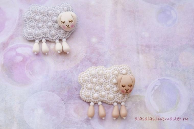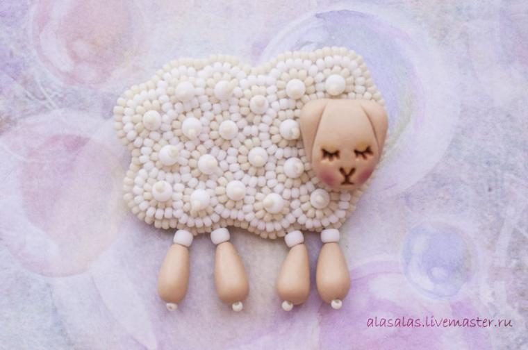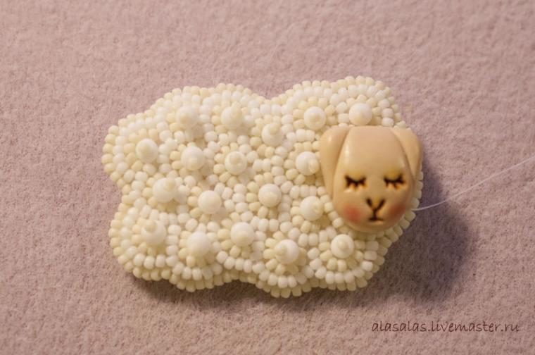 Брошка-овечка готова! Экспериментируя с формой мордочки, цветом пластики и бисера, можно получить совсем других овечек.