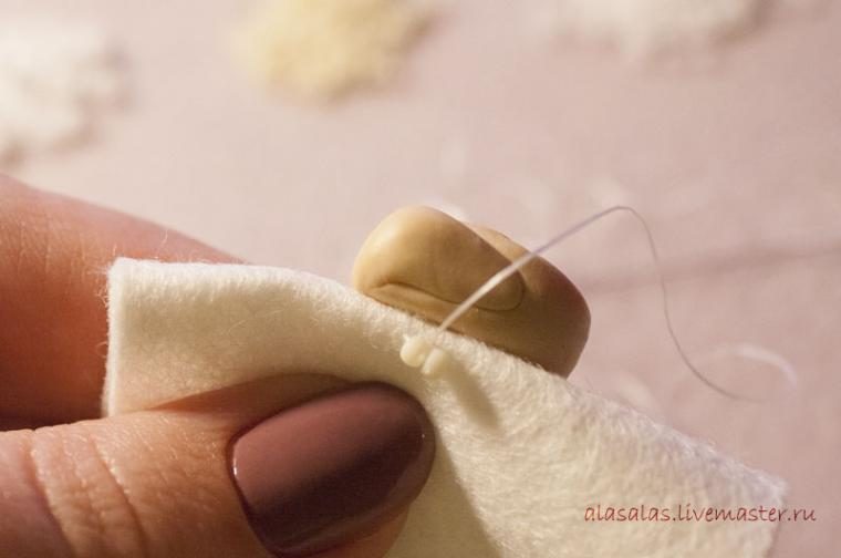 Теперь отрезаем нить подлиннее (2-2,5 м), выводим между ultrasuede и фетром на лицо.