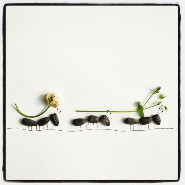 В ее обаятельных и ироничных работах совмещаются рисунки и подручные предметы: в ход идут карандаши, шарики, фрукты и даже семечки.