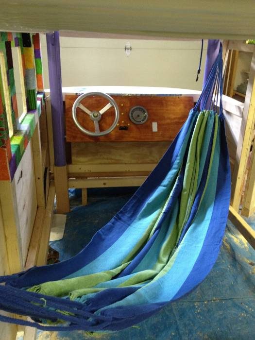 Кровать находится на втором ярусе, в то время как на первом ярусе расположена игровая комната с гамаком.
