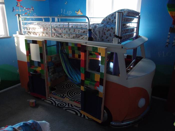 К металлическому каркасу старой двухъярусной кровати отец ребенка прикрепил съемные панели и оригинальные детали от автомобиля Volkswagen Beetle, которые валялись в его гараже. Примерная стоимость затрат на изготовление такой кровати – 100 долларов.