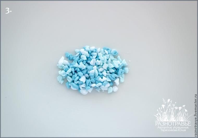 1. Я взяла глину трёх цветов: пастельный голубой, белый полупрозрачный и фимо-эффект «голубой ледяной кварц». Если у вас нет «кварца», то можно взять белую полупрозрачную полимерку и подмешать в неё совсем немного синей полупрозрачной.