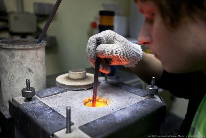 Начинается все в плавильно-заготовительном цехе. Чтобы сделать золото прочнее, в него добавляют легирующие металлы: серебро, медь, палладий и никель. Процент золота, который остается в получившейся смеси, называется «пробой».