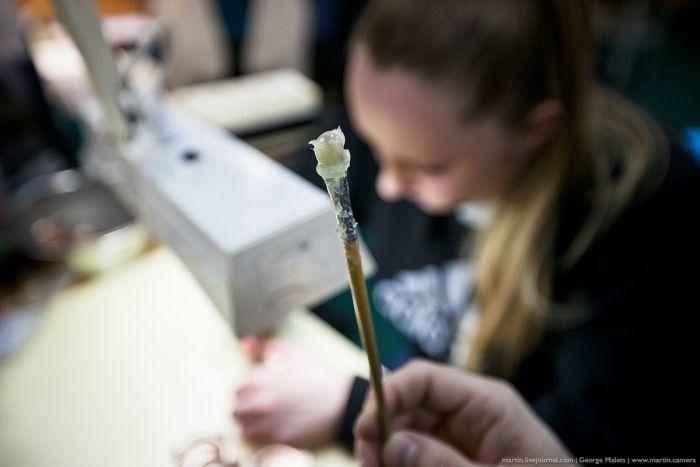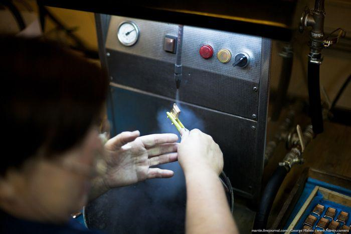 Стружка, оставшаяся после обработки деталей, собирается кисточками и совочками в специальные баночки, чтобы её было потом легче сдавать на переработку. Аккуратности производства значительно способствует высокая цена золота.