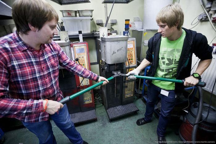 Можно подумать, что в цеху штамповки шумно, как и на других производствах, связанных с металлом, но это не так. Золото и серебро мягкие металлы, поэтому в помещении довольно тихо.