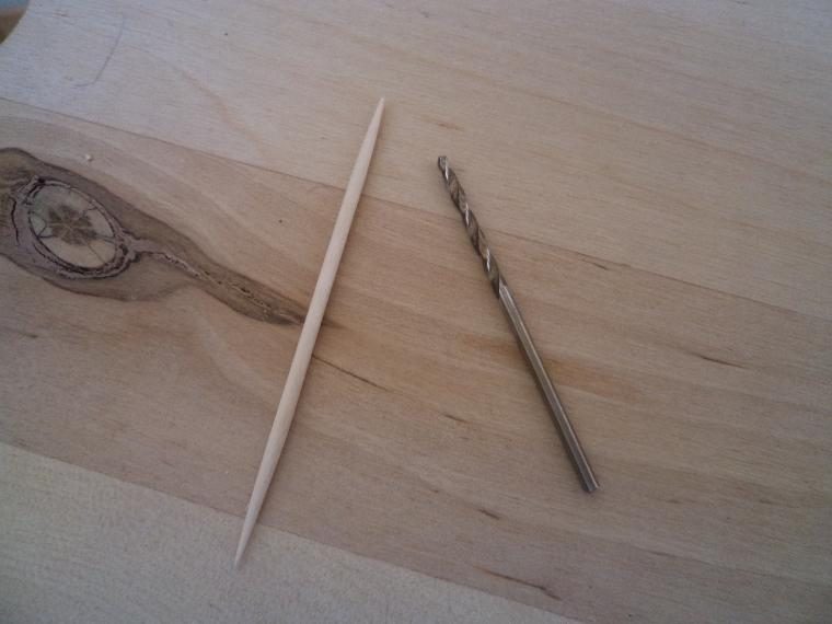 Теперь приступаем к изготовлению заливной и сливной пробок. Для этого нам понадобится деревянная зубочистка, сверло такого же диаметра, как и у зубочистки, а также дрель, шило и канцелярский нож.