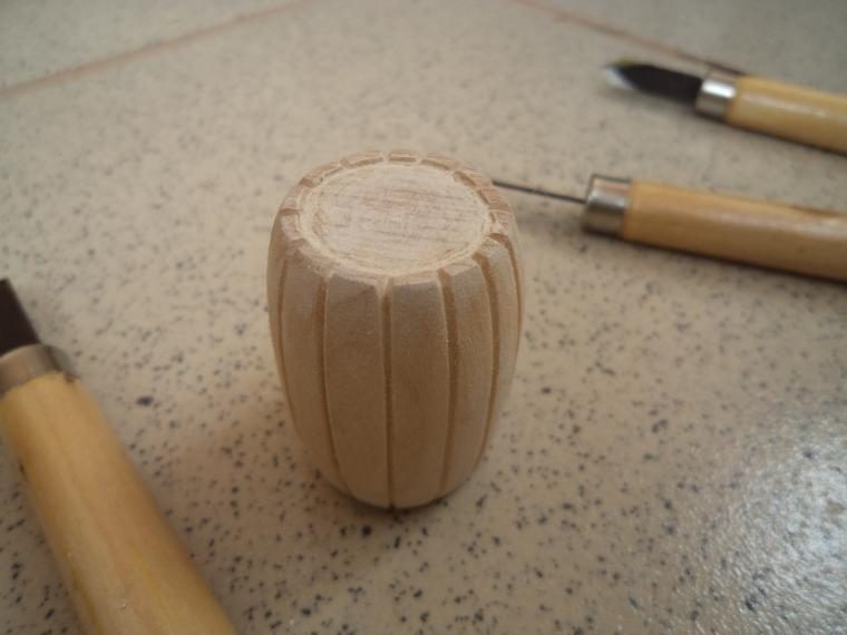 После этого с помощью треугольного в сечение надфиля (маленького напильника), пропиливаем одним из его углов углубления вдоль линий, прочерченных карандашом, придавая нашей бочке рельеф.